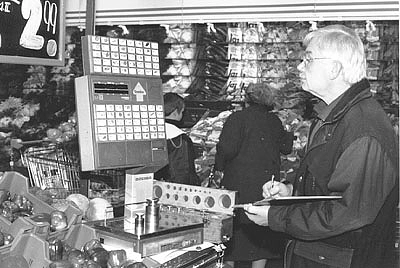 Mit Prüfgewichten kontrolliert der Eichbeamte hier eine Obstwaage